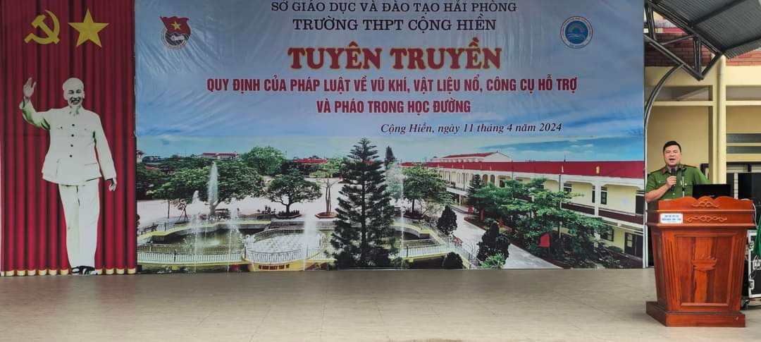 Thực hiện công văn số 885/ SGDĐT- VP ngày 28/3/2024 của Sở GD & ĐT Hải Phòng về việc tuyên truyền quy định của pháp luật về vũ khí, vật liệu nổ, công cụ hỗ trợ và pháo trong học đường, chiều ngày 11/4/2024, trường THPT Cộng Hiền đã tổ chức buổi tuyên truyền cho toàn thể CBGVNV và HS. Về dự tuyên truyền đại diện lãnh đạo nhà trường có đc Nguyễn Đình Xuân- PBTCB- PHT; đc Vũ Thị Mận- PHT. Đại diện Công an TP có đc thiếu tá Vũ Hoàng Anh - Phó đội trưởng phòng CSQL hành chính về trật tự XH công an TP; thiếu tá Đỗ Tiến Hưng- cán bộ phòng CSQL hành chính về trật tự XH công an TP. Tổ công tác đã phổ biến cho học sinh và đội ngũ cán bộ, giáo viên, nhân viên nhà trường về nội dung cơ bản của Luật Quản lý, sử dụng vũ khí, vật liệu nổ và công cụ hỗ trợ; Nghị định 137/2020/NĐ-CP của Chính phủ về quản lý, sử dụng pháo; các chế tài xử lý, những nguy cơ về tai nạn về vũ khí, vật liệu nổ, công cụ hỗ trợ và pháo; đồng thời, phối hợp với gia đình quản lý, giáo dục con em chấp hành nghiêm các quy định của pháp luật về lĩnh vực này trong thời gian nghỉ lễ, tết. Tổ công tác đã dành thời gian hướng dẫn chi tiết cách kiến nghị, phản ánh về hành vi sản xuất, mua bán, vận chuyển, tàng trữ, sử dụng vũ khí, vật liệu nổ, công cụ hỗ trợ và pháo nổ, pháo hoa nổ trái pháp luật qua ứng dụng VNeID. Nhờ buổi tuyên truyền hữu ích đã giúp cho toàn bộ học sinh, cán bộ, giáo viên, nhân viên của nhà trường có thêm những hiểu biết sâu sắc về quản lý, sử dụng vũ khí, vật liệu nổ, công cụ hỗ trợ và pháo, và không có hành vi sai trái vi phạm PL.