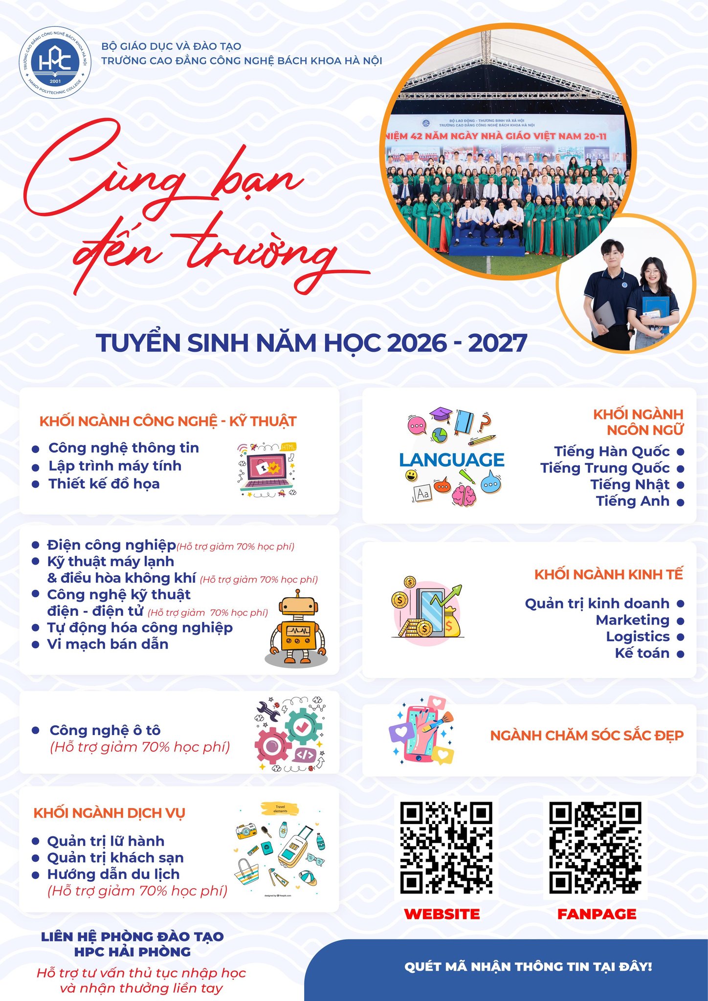 Trường Cao đẳng Công nghệ Bách khoa Hà Nội (HPC) – Cơ sở Hải Phòng thông báo kế hoạch tuyển sinh năm học 2026 - 2027. Với tôn chỉ "Thực học - Thực hành - Thực nghiệp", HPC khẳng định vị thế là đơn vị đào tạo uy tín, cung ứng nguồn nhân lực chất lượng cao cho thị trường lao động trong và ngoài nước.