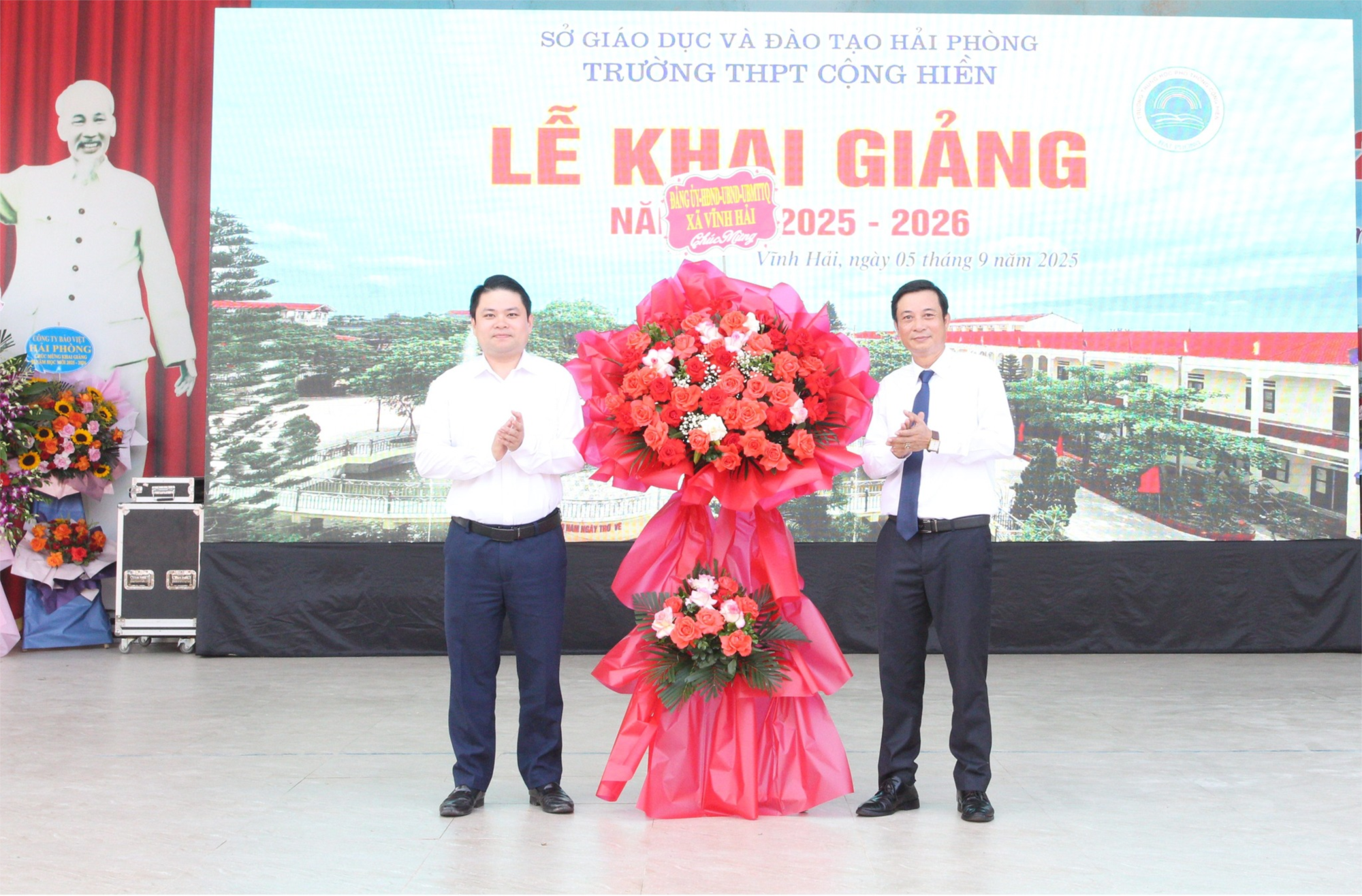 Sáng ngày 05/9/2025, hoà chung không khí thiêng liêng, trang trọng kỷ niệm 80 năm truyền thống ngành Giáo dục ( 1945- 2025), thầy và trò trường THPT Cộng Hiền long trọng tổ chức Lễ khai giảng năm học 2025- 2026. Dự Lễ khai giảng của nhà trường về phía đại diện lãnh đạo Đảng bộ, UBND, công an xã Vĩnh Hải có sự hiện diện của Đồng chí Nguyễn Văn Hiếu, Phó Bí thư Thường trực Đảng ủy ; đồng chí Lê Minh Tuân, Ủy viên Đảng ủy, Trưởng phòng Kinh tế ; đồng chí Hoàng Văn Anh, Phó trưởng Công an; đồng chí Trần Ngọc Thuấn, Phó Chánh Văn phòng Đảng ủy. Đại diện CMHS có sự hiện diện của các bác thường trực Ban đại diện CMHS trường, các bác trưởng ban đại diện CMHS lớp. Về phía nhà trường có sự hiện diện của thầy giáo Hoàng Minh Toàn- BTCB- Hiệu trưởng, các thầy cô giáo trong Cấp uỷ, BGH, các đồng chí CBGVNV và hơn 1300 học sinh. Nhà trường còn được trân trọng đón tiếp các quý vị đại biểu đại diện cho cơ quan, doanh nghiệp đến chúc mừng nhà trường nhân dịp năm học mới! Trong chương trình khai giảng nhà trường đã tổ chức vinh danh học sinh, giáo viên có thành tích đặc biệt xuất sắc trong công tác thi tốt nghiệp năm 2025, vinh danh học sinh có điểm cao trong kỳ thi vào lớp 10 năm 2025- 2026, tặng quà của ngân hành Agribank chi nhánh Đông HP, cửa hàng xe đạp Trình Anh cho học sinh có hoàn cảnh đặc biệt khó khăn. Đúng 8 giờ 00 phút các quý vị đại biểu, thầy và trò nhà trường cùng dự Lễ khai giảng trực tuyến của Bộ Giáo dục qua kênh VTV1. Xin gửi lời tri ân sâu sắc của nhà trường đến Sở GD&ĐT Hải Phòng; Huyện uỷ , UBND huyện Vĩnh Bảo ( cũ), các cơ quan đoàn thể; các bậc cha mẹ học sinh....đã giúp đỡ nhà trường hoàn thành xuất sắc nhiệm vụ năm học 2024- 2025. Năm học mới đã đến, nhà trường kính mong tiếp tục nhận được sự quan tâm chỉ đạo tạo điều kiện của Sở GD&ĐT; của Đảng bộ, UBND xã Vĩnh Hải; sự đồng lòng, chung sức, ủng hộ của các bậc cha mẹ học sinh; sự quan tâm của các cơ quan, tổ chức, đoàn thể và cùng với sự quyết tâm, nỗ lực của CBGVNV , học sinh để trường THPT Cộng Hiền gặt hái được nhiều thành tích rực rỡ hơn nữa. Xin trân trọng cảm ơn!